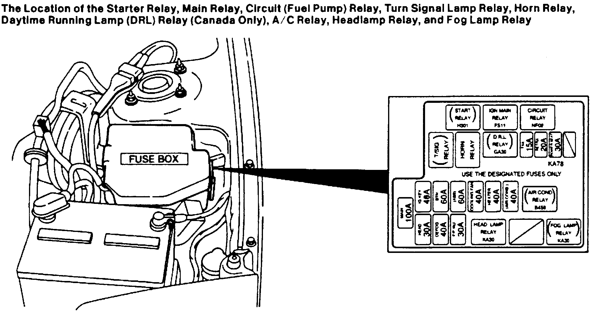 The relay center is located on left front inner fender, in the engine compartment, near battery.