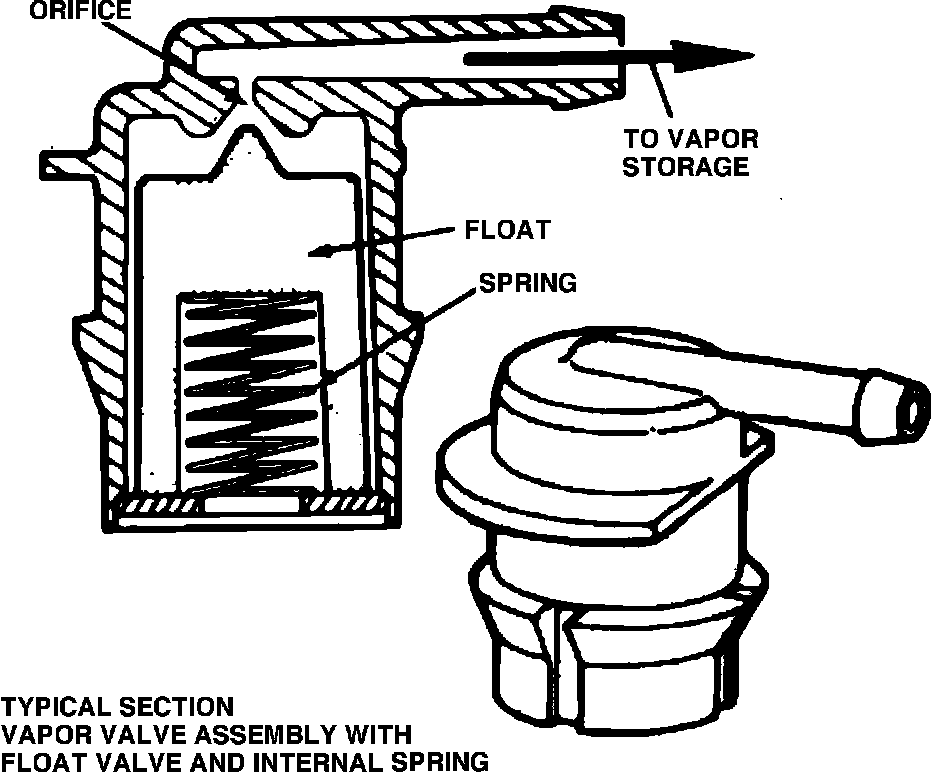 If liquid fuel should enter the valve assembly, the float will rise upward and close the orifice. As the fuel is drained back into the fuel tank, the spring attached to the underside of the valve pulls the float downward, exposing the orifice.