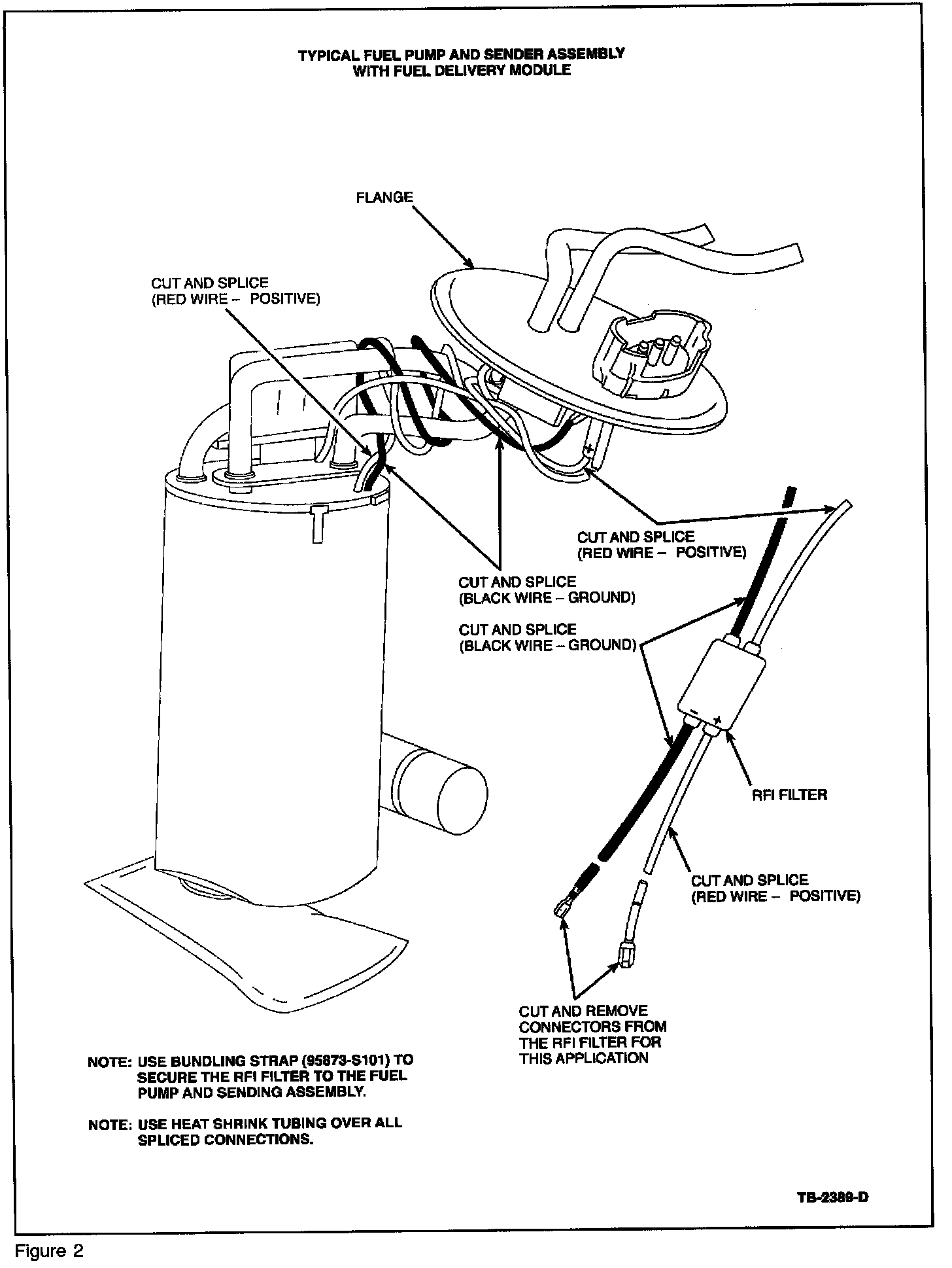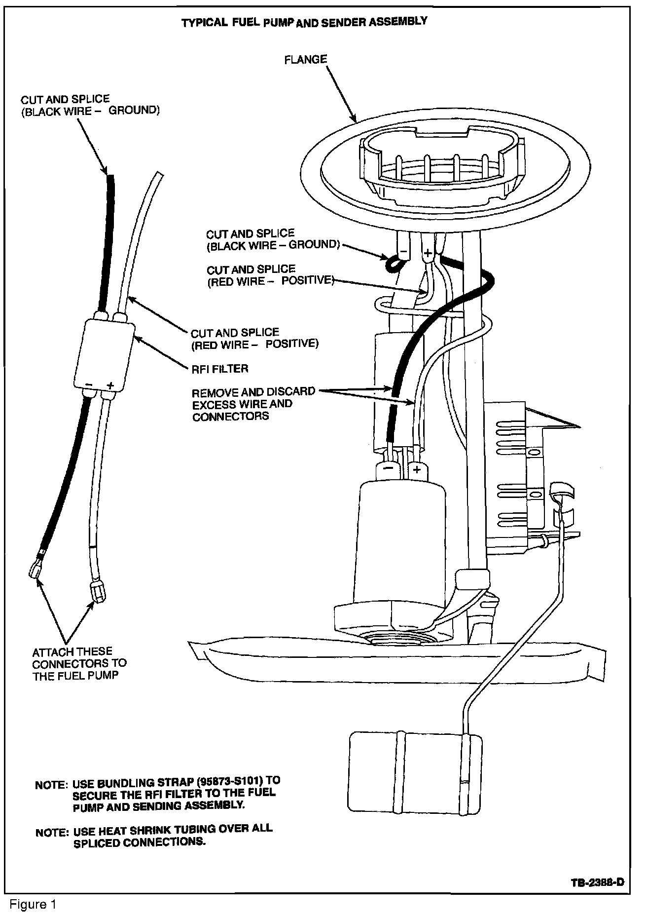 4. Secure the RFI filter to the fuel pump and sender assembly with a Bundling Strap (95873-S101) to prevent rattling in the tank, Figures 1 and 2.