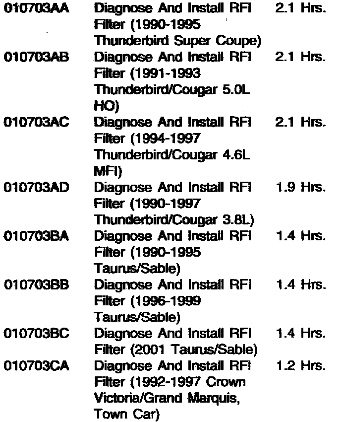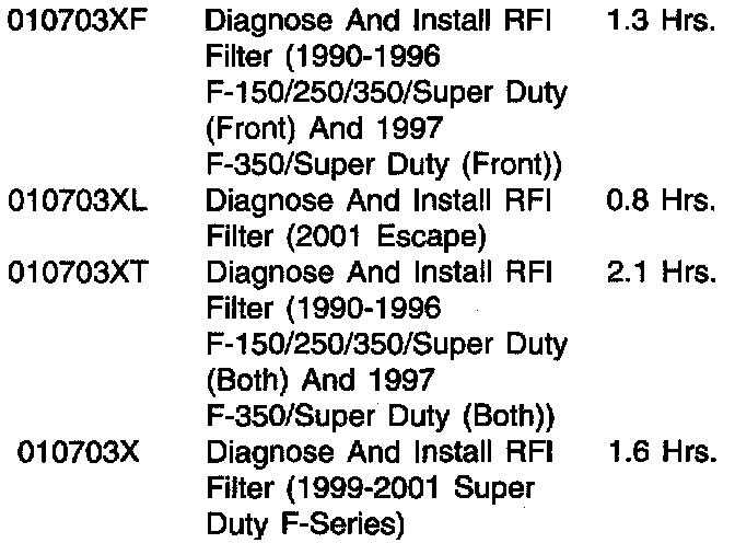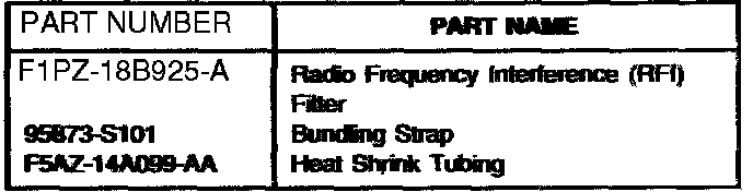 Install an electronic noise Radio Frequency Interference (RFI) Filter (F1PZ-18B925-A) on the fuel pump inside the fuel tank. Refer to the following Test Procedure to confirm that the concern exists, then refer to the Service Procedure for repair details.