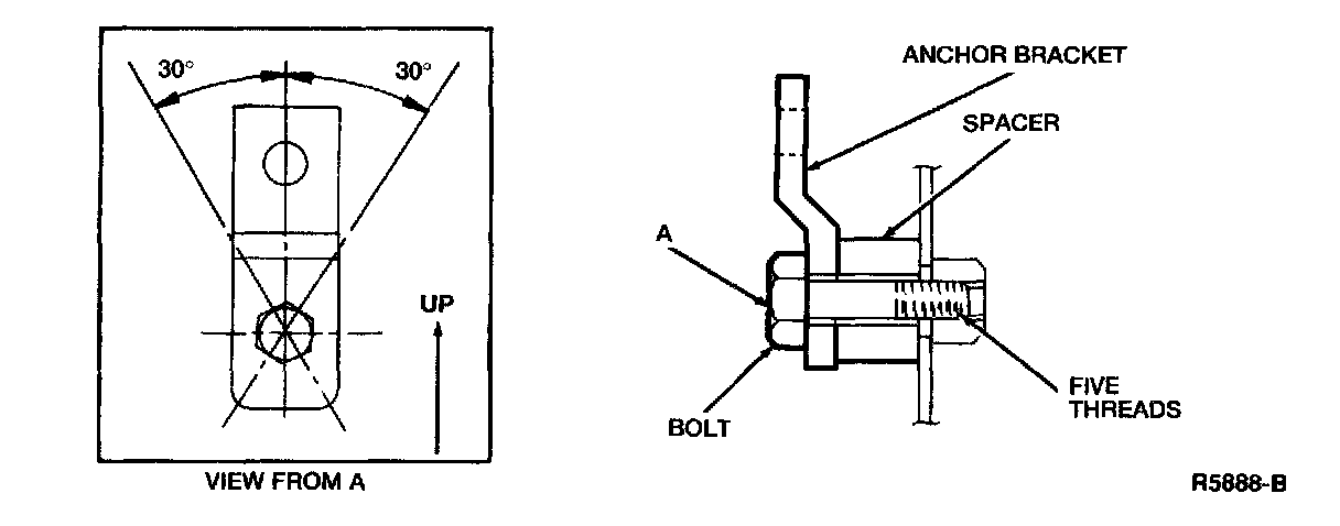 4. Install an 8 mm bolt, making sure that at least five threads engage in the panel. Be sure the anchor bracket is within a 30 degree angle as indicated.
