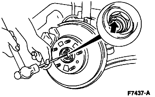 4. Remove the front axle wheel hub retainer. Discard the retainer. It must not be reused.