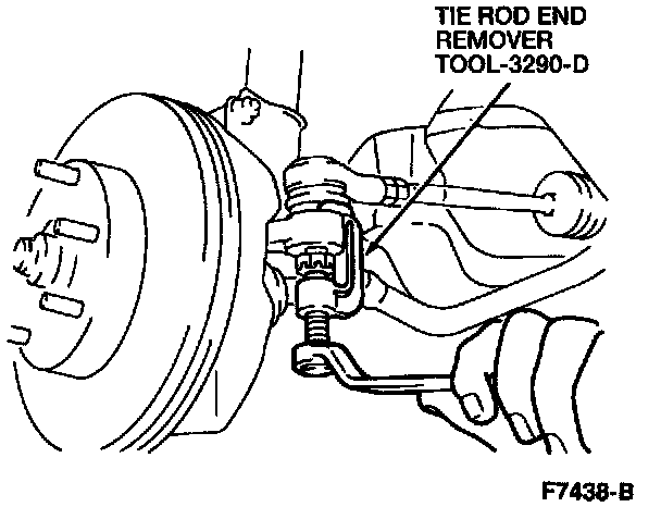 6. Use tie Rod End Remover TOOL-3290-D or equivalent to separate the front wheel spindle connecting rod or end from the front wheel knuckle.