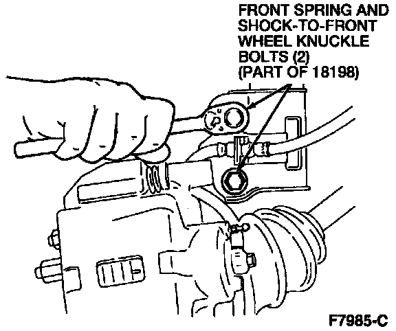 9. Remove the two front spring and shock-to-front wheel knuckle bolts.