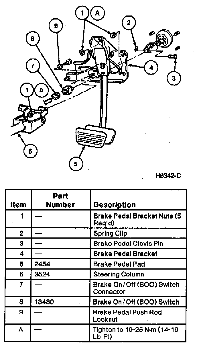 6. Install the five brake pedal bracket nuts. Tighten the brake pedal bracket nuts to 19-25 Nm (14-19 ft. lbs.).