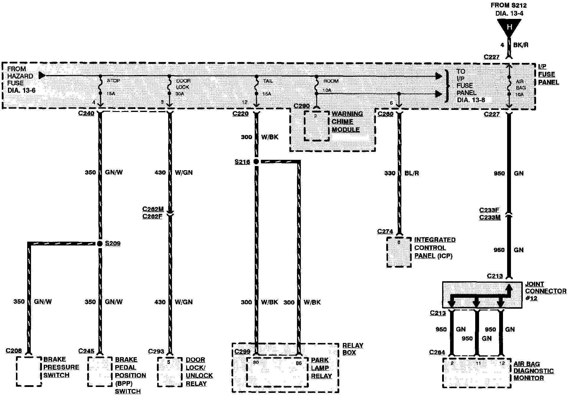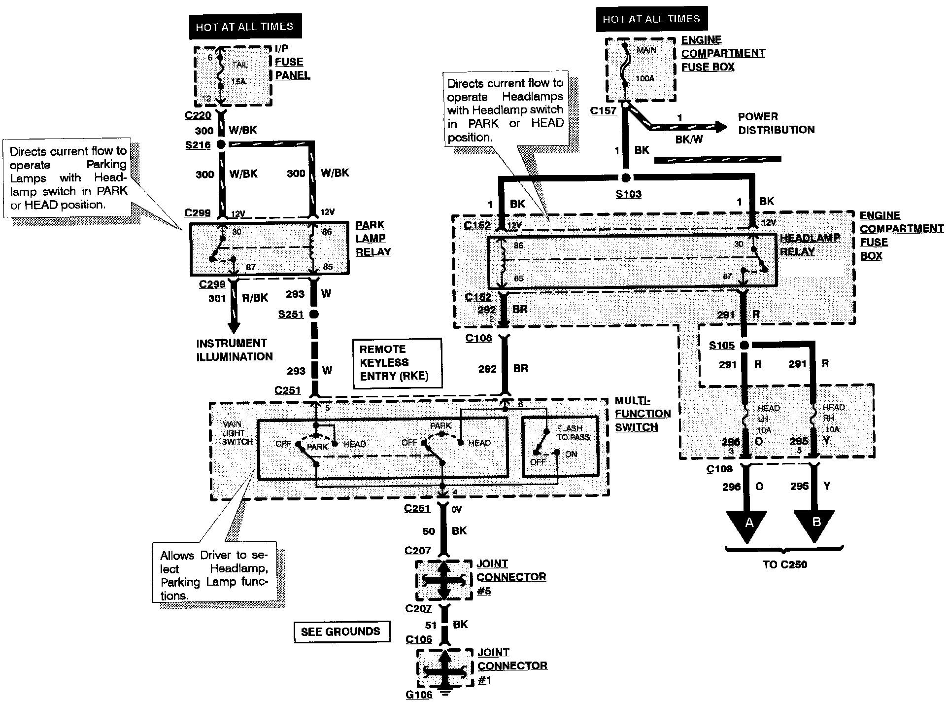 Components that work together are shown together in a system/subsystem diagram or set of diagrams. The system feed (circuit breaker, fuse, etc.) is shown at the top of a diagram page. All wires, connectors, components, and splices are shown in the same manner that the current flows, ending at the ground at the bottom of a diagram page. Circuits that go from one diagram page to another will be marked with large arrow heads.