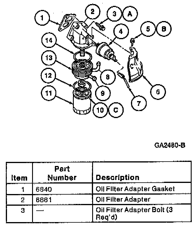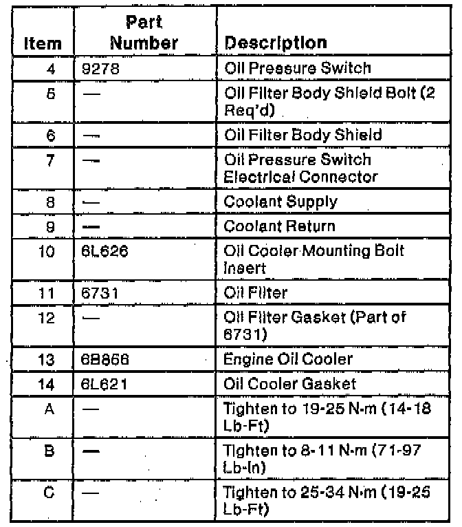 1. Position the engine oil cooler with an oil cooler gasket on the oil filter adapter. Install the oil cooler mounting bolt insert. Tighten the oil cooler mounting boll insert to 25-34 Nm (19-25 ft. lbs.).