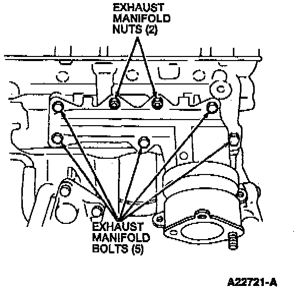 8. Remove two exhaust manifold nuts and five bolts from the exhaust manifold and remove the exhaust manifold and the exhaust manifold gasket from the vehicle.