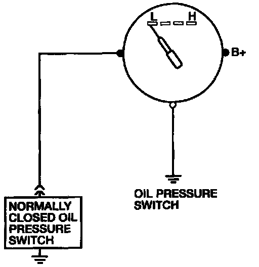 The oil pressure gauge operates using a ground signal from the oil pressure switch. With the oil pressure switch open (engine running), the gauge reads normal. When the oil pressure switch is closed (engine off), the gauge reads low. There is no adjustment, calibration, or maintenance for the gauge.