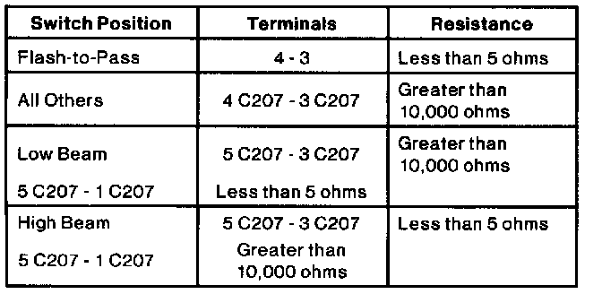 3. Measure the resistance between these terminals on the multi-function switch C207 with the switch in the positions as indicated in the illustration.