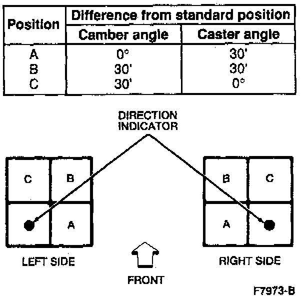 NOTE: The front shock absorber upper mounting bracket studs on the front spring and shock are offset. Camber is adjusted by rotating the front shock absorber upper mounting bracket to one of the following 3 positions: