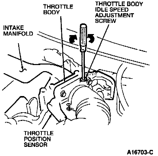 12. Adjust the idle speed by turning the throttle body idle speed adjustment screw until the idle speed of 650 rpm +/- 50 rpm is attained.