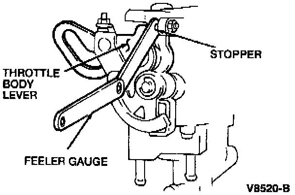 16. Insert a 0.15 mm (0.006 inch) feeler gauge between the stopper and the throttle body lever.