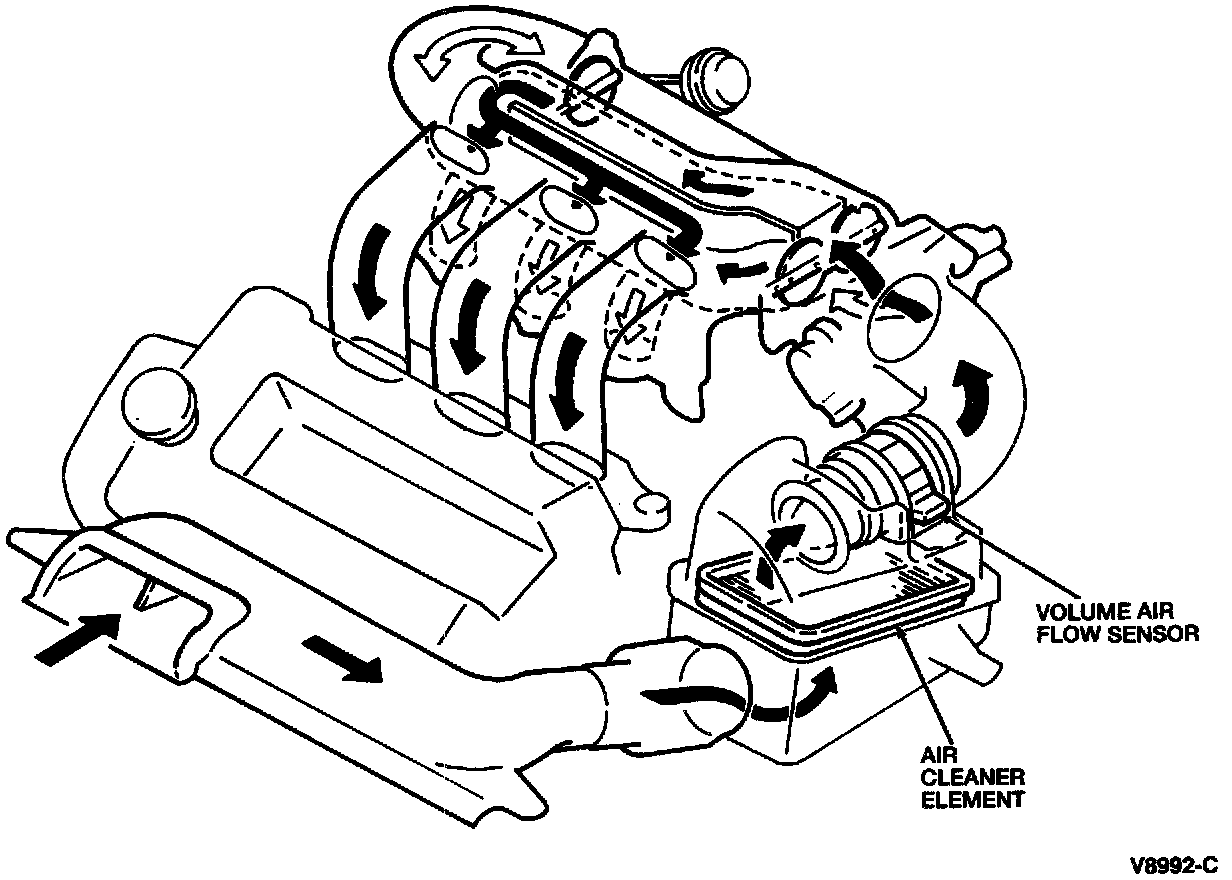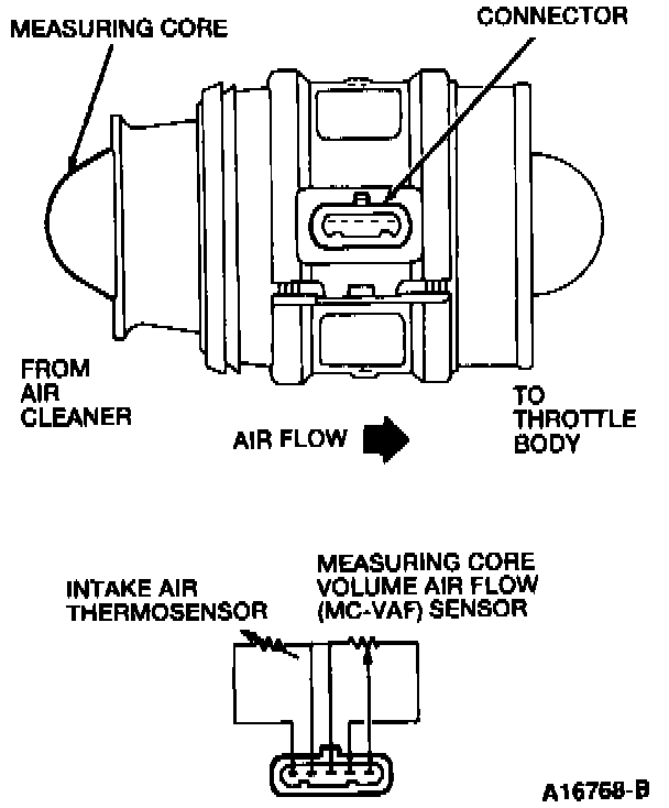 The Volume Air Flow (VAF) sensor detects the amount of intake air and converts the measurement into a voltage by means of a potentiometer. The voltage signal is sent to the Powertrain Control Module (PCM) which in turn determines fuel injection quantities. The voltage increases and decreases as the VAF sensor opening changes in size. The VAF sensor also incorporates a sensor to detect intake air temperature.