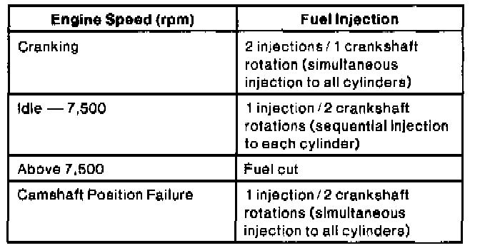 When the engine is cranking, fuel is supplied to all the cylinders simultaneously, one injection for each fuel injector per crankshaft revolution. Between engine idle speed and 7,500 rpm, during PCM or Camshaft Position Sensor (CMP) failure, fuel is supplied through the fuel injectors once every two crankshaft revolutions (one injection per cycle).