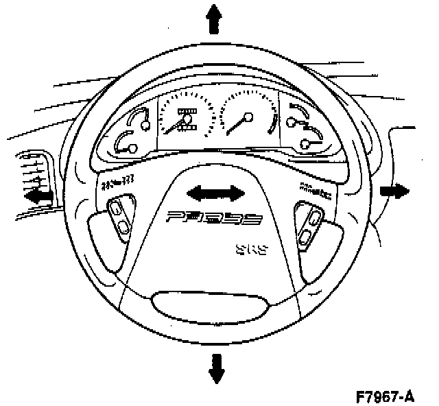3. Move the steering wheel in the direction of the arrows as shown. As these movements are being executed check for steering shaft joint play, steering wheel looseness, or steering column looseness, and repair or replace as necessary.