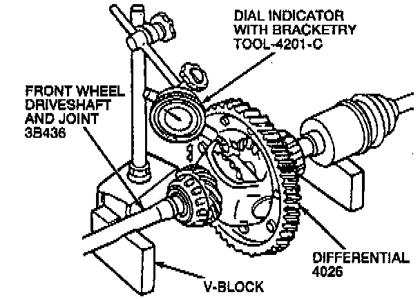 c. Use Dial Indicator with Bracketry T50T-4201-C or equivalent to measure the backlash of both differential pinion gears. If the backlash is more than allowable, replace the differential as an assembly.