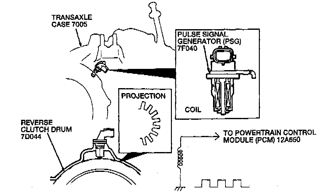 The pulse signal generator (PSG) is magnetic-pickup and located on the transaxle case. It detects the reverse clutch drum speed. There are 32 projections on the reverse clutch drum. As the reverse clutch drum rotates, the PSG produces an AC wave and sends it to the power train control module (PCM).