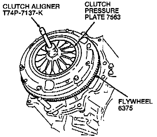 NOTE: Use Clutch Aligner T74P-7137-K to avoid dropping the clutch disc when the bolts are removed from the clutch pressure plate.