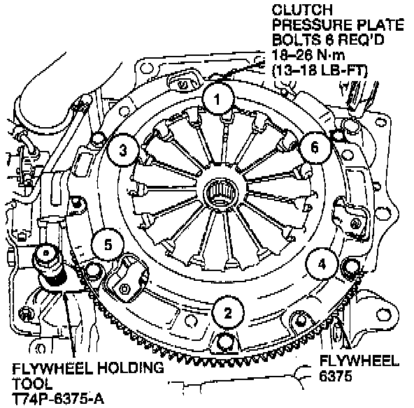 3. Install the clutch pressure plate. Tighten the clutch pressure plate bolts to 18-26 Nm (13-18 ft. lbs.) in the sequence shown. Use Flywheel Holding Tool T74P-6375-A to hold the flywheel while tightening the bolts.