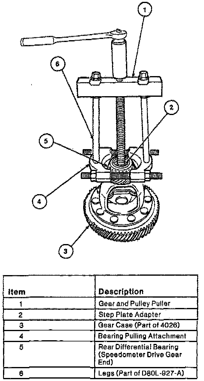 5. Use Gear and Pulley, Pull D80L-522-A Step Plate Adapter D80L-630-3 (part of D80L-630-A), Bearing Pulling Attachment D84L-1123-A, and the Legs from Push-Pull Set D80L-927-A or equivalents to remove the rear differential bearing (speedometer drive gear end).
