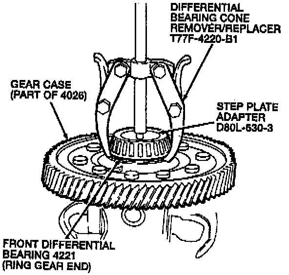 7. Use Differential Bearing Cone Remover/Replace T77F-4220-B3 and Step Plate Adapter D80L-630-3 (part of D80L-630-A) or equivalent to remove the front differential bearing (ring gear end).