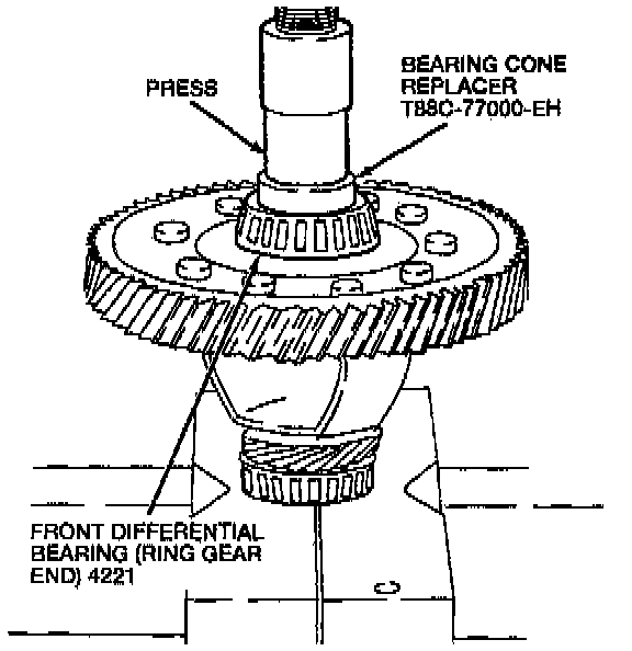 2. Use either Driver Handle T80T-4000-W or a press, and Differential Bearing Cone Replace T88C-77000-EH and install the front differential bearing (ring gear end).