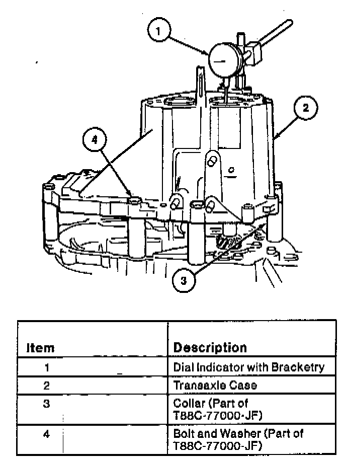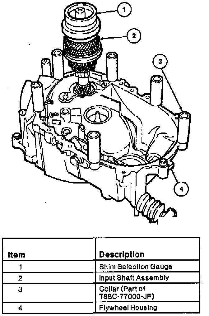 NOTE: Whenever the transaxle is disassembled, the bearing preload must be adjusted. The input shaft preload can be adjusted by selecting shims to insert between the fourth gear end bearing cups and the transaxle case. To determine the correct thickness shim, use Shim Selection Sets T88C-77000-JF and T88C-77000-C, along with the following procedure:1. Install the input shaft third gear end bearing cup into the flywheel housing.