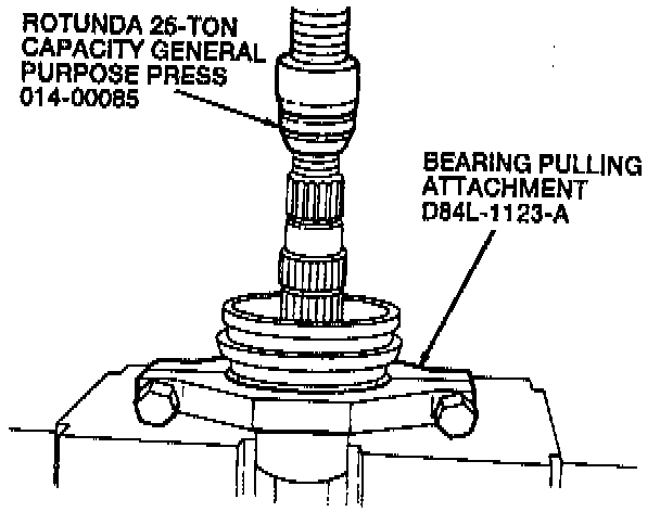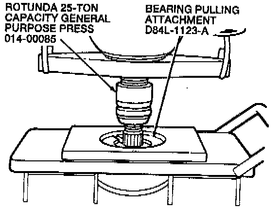9. Use a Rotunda 25-Ton Capacity General Purpose Press 014-00085 and Bearing Pulling Attachment D84L-1123-A or equivalent to remove the bearing (fourth gear end).