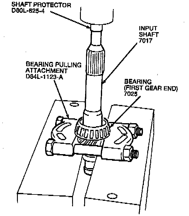 16. Use Bearing Pulling Attachment D84L-1123-A and Shaft Protector D80L-625-4 or equivalent to remove the bearing (first gear end) from the input shaft.