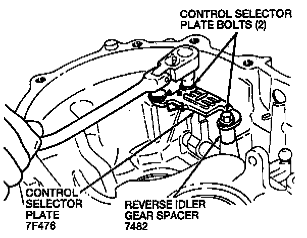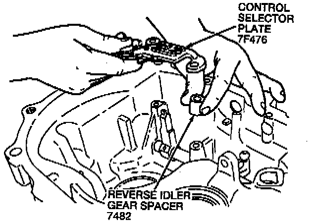 37. Remove the two control selector plate bolts, then the control selector plate and the reverse idler gear spacer.