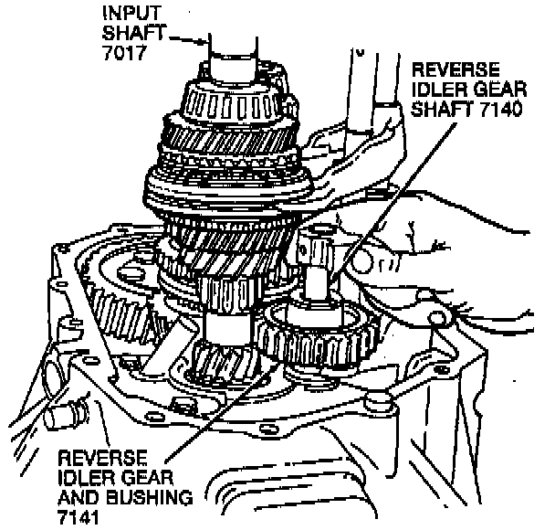 26. Remove the reverse idler gear and bushing and the reverse idler gear shaft from the flywheel housing.
