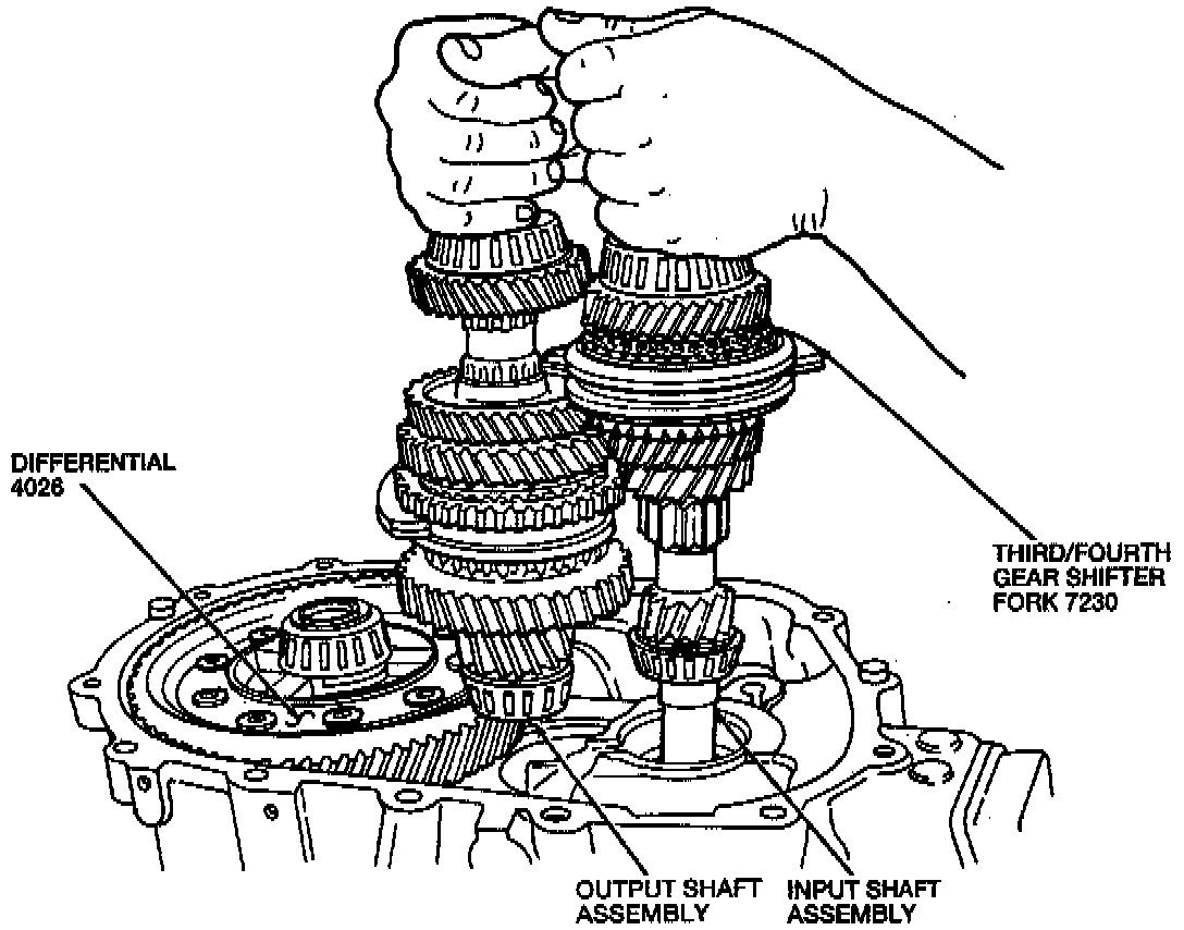 35. Remove the third/fourth gear shifter fork and main shift control shaft along with the input shaft and output shaft assemblies.