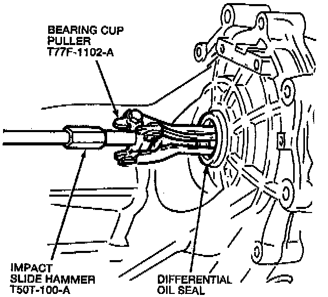 50. Use Impact Slide Hammer and Bearing Cup Puller T77F-1102-A to remove the differential oil seal from the transaxle case.